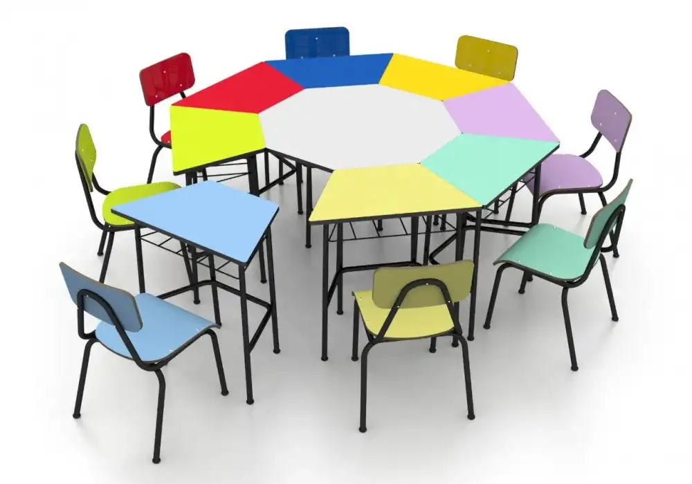 O Conjunto Oitavado Infantil é ideal para salas de aula da Educação Infantil, promovendo interação, segurança e aprendizado coletivo. Composto por 8 cadeiras, 8 carteiras trapezoidais e uma mesa central octogonal, cria um ambiente lúdico, colorido e estimulante.