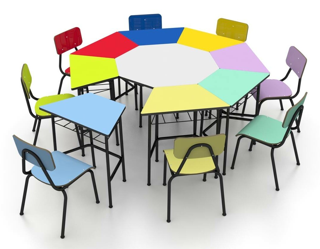 O Conjunto Oitavado Juvenil foi desenvolvido para salas de aula modernas e colaborativas, promovendo trabalho em grupo, organização e conforto. Composto por 8 cadeiras, 8 carteiras trapezoidais e uma mesa central octogonal, cria um ambiente ergonômico, seguro e visualmente atrativo.